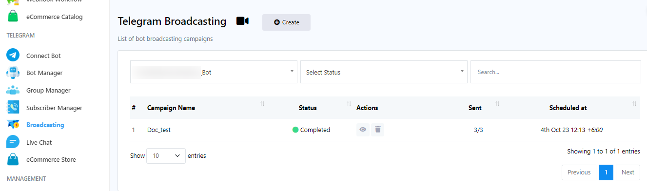 - Select a bot to send broadcast message from dropdown menu.
